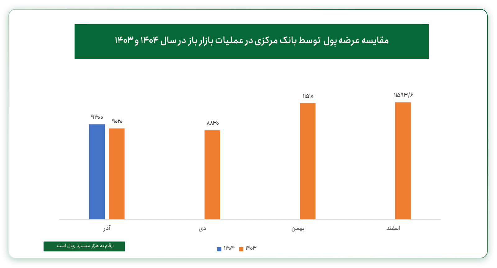 در آذرماه سال جاری بانک مرکزی تنها با ۹۴۰۰ هزار میلیارد تومان پول به بانکهای تجاری تزریق کرده که تقریبا اندازه آذر ماه سال گذشته است.