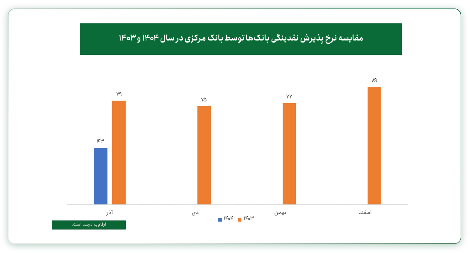 بانک مرکزی در آذرماه سال جاری تنها ۴۳ درصد از درخواست نقدینگی بانکها را تامین کرده است. در حالی که در مدت مشابه در سال گذشته ۷۹ درصد از درخواست نقدینگی بانکها را تامین کرده بود. شوک پولی وارد شده به سیستم بانکی کشور در جریان جنگ ۱۲ روزه، موجب شد بانک مرکزی سیاست پولی انقباضی شدید را ادامه دهد. با این حال، تقاضای پول در هفتههای پایانی سال به طور طبیعی افزایش پیدا خواهد کرد و باید دید بانک مرکزی در ۳ ماه پایانی سال چه سیاستی را برای مدیریت بازار پول اتخاذ خواهد کرد. لازم به ذکر است سیاستهای پولی تاثیر خود را با وقفه بر تورم خواهند گذاشت.
