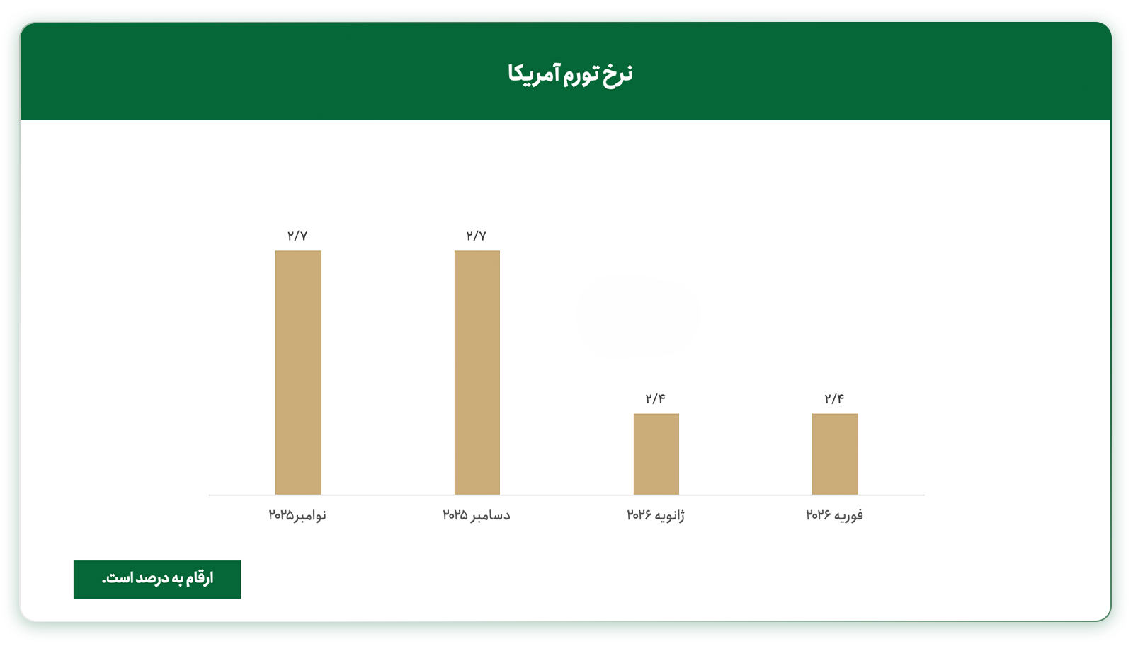 بانک مرکزی آمریکا(فدرال رزرو) در آخرین جلسه خود در اواسط ماه مارس، نرخ بهره را در محدوده ۵/۳ تا ۷۵/۳ حفظ کرد. پیش از وقوع جنگ، انتظار میرفت فدرال رزرو حداقل یک واحد دیگر نرخ بهره را کاهش دهد. در حال حاضر نرخ تورم آمریکا در ماه فوریه ۲۰۲۶ نیز بدون تغییر باقی مانده و باید منتظر نرخ تورم در ماه مارس ماند.