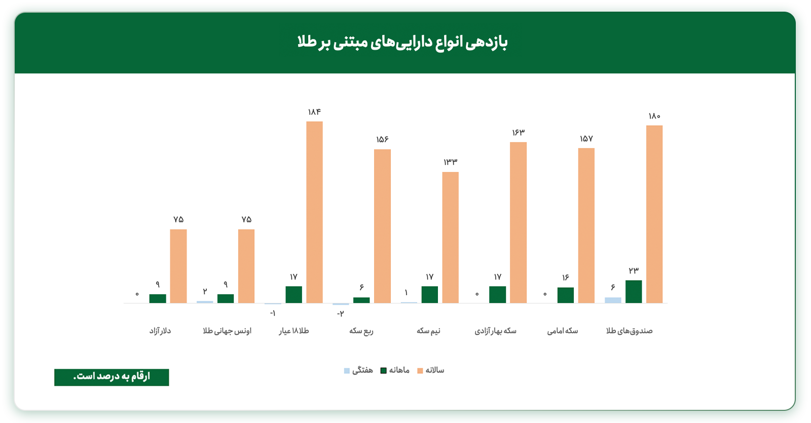 بررسی تغییرات بازدهی انواع داراییهای مبتنیبر طلا میتواند در تصمیمگیری جهت سرمایه گذاری در طلا موثر باشد. در تحلیل هفتگی طلا، بازدهی هفتگی، ماهانه و سالانه انواع سکه طلا، صندوق طلا، دلار و اونس جهانی طلا بهروز میشود. در هفتهای که گذشت صندوقهای طلا در بازه زمانی هفتگی و ماهانه بیشترین بازدهی را کسب کردهاند.