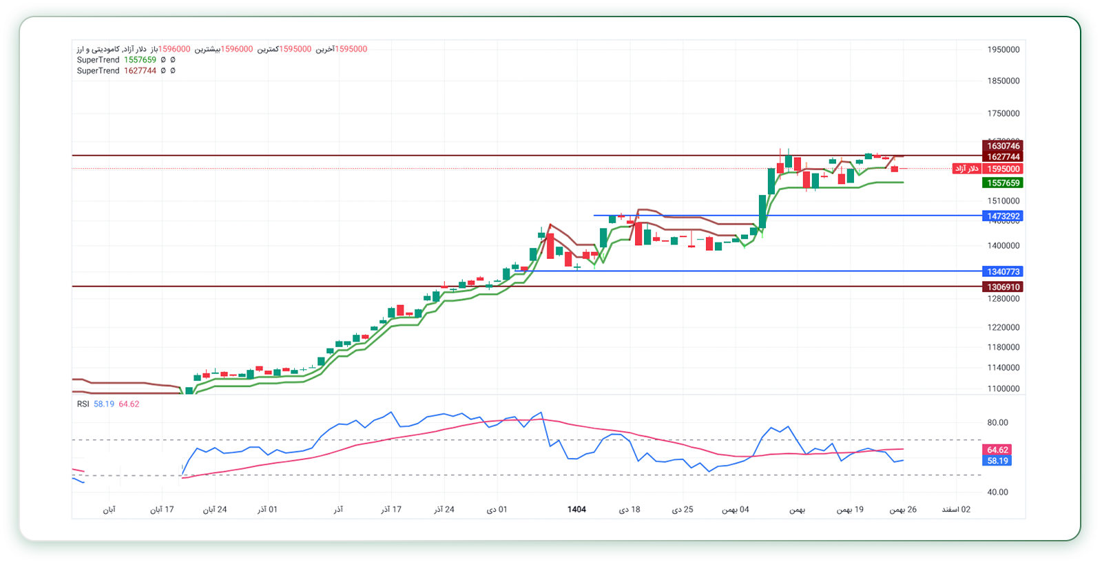 تحلیل تکنیکال دلار به سرمایهگذاران در خرید طلا و صندوق طلا کمک میکند و بر اساس چارت روزانه دلار، مقاومت ۱۶۳ هزار تومان در کوتاهمدت مانع از افزایش قیمت دلار به سطوح بالاتر شده است. از سوی دیگر، شکلگیری یک ناحیه حمایتی در قیمت ۱۵۵ هزار تومان باعث شده تا قیمت به کمتر از ۱۵۵ هزار تومان نرسد. اندیکاتورهای سوپرترند در حال حاضر روندی خنثی در دلار را نشان میدهند و اندیکاتور RSI نیز پایینتر از میانگین متحرک ساده ۲۰ روزه قرار دارد. با این وجود، انتشار هرگونه خبر منفی یا مثبت میتواند به قیمت شوک وارد کرده و مسیر تحلیل تکنیکال دلار را با انحراف مواجه کند.