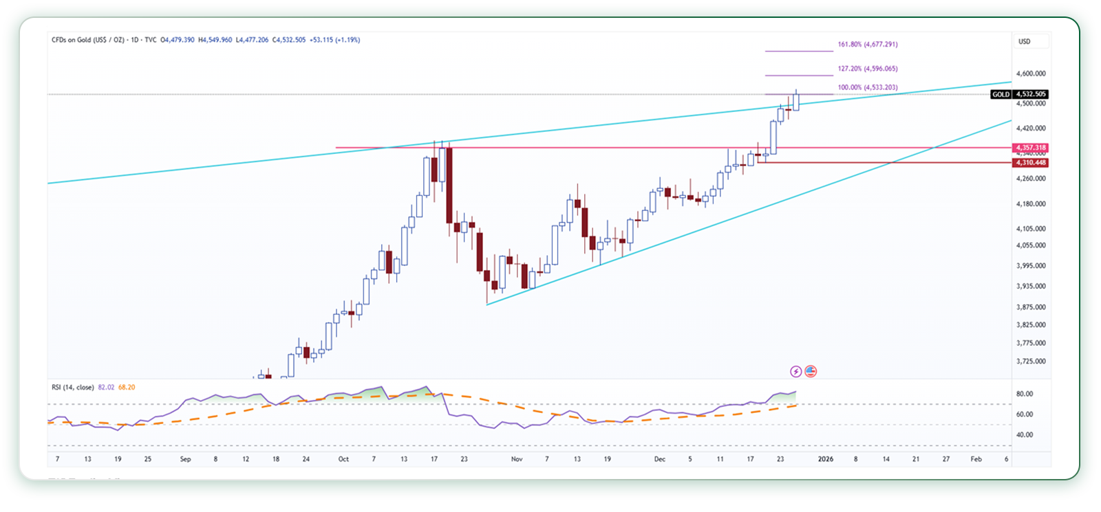 همان‌طور که در تحلیل تکنیکال اونس طلا در هفته گذشته بررسی شد، با خروج قیمت از الگوی مثلث افزایشی، یک سقف جدید در قیمت ۴۵۳۲ دلار شکل گرفت. با توجه به سطوح فیبوناچی گسترشی و فاصله میانگین متحرک ساده ۲۰ روزه، به نظر می‌رسد اونس جهانی طلا می‌تواند به سمت اهداف ترسیمی حرکت کند.