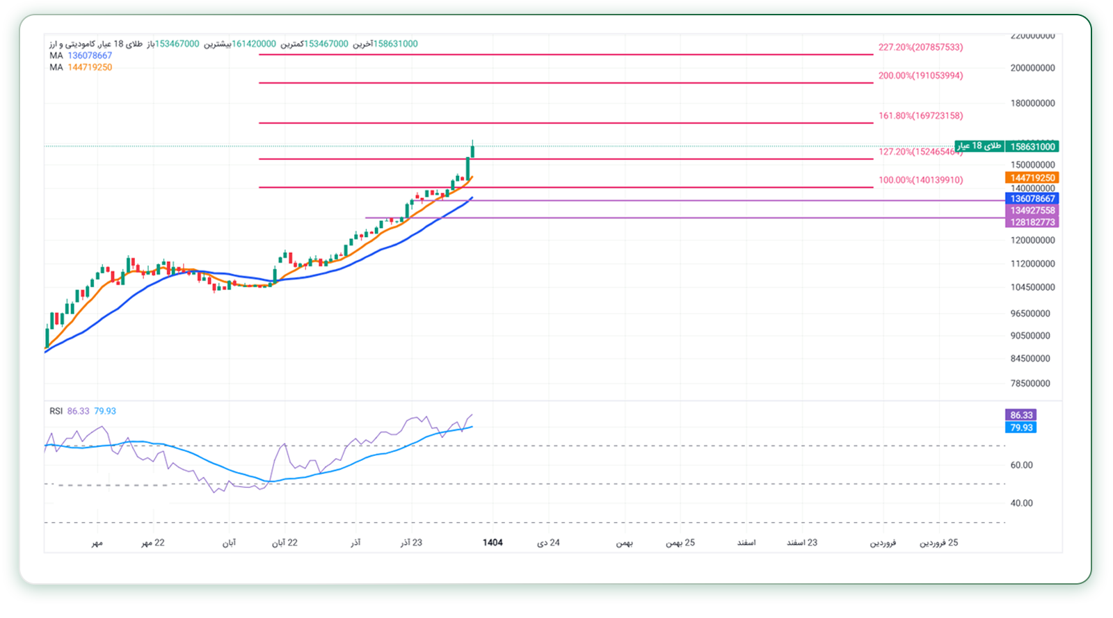 قیمت هر گرم طلای ۱۸ عیار به سطح ۱۶ میلیون تومان رسیده و بررسی سطوح فیبوناچی گسترشی، ادامه مسیر صعودی این فلز گران‌بها را تأیید می‌کند. خطوط بنفش در نمودار نیز نواحی کف‌های بالقوه قیمت را در صورت بروز اصلاح نشان می‌دهند.