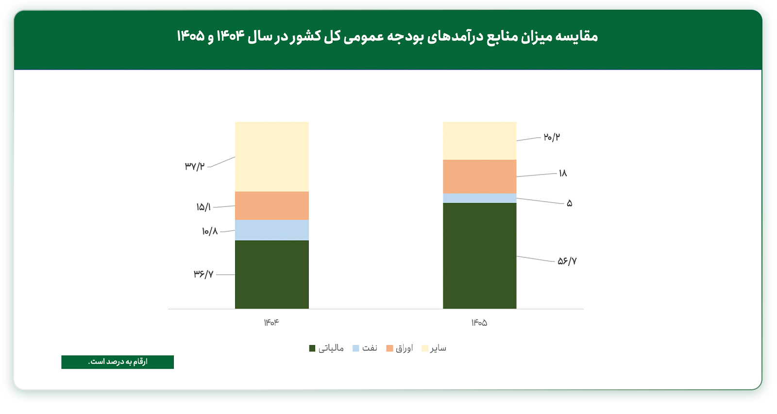 همان‌طور که مشاهده می‌شود، حدود ۵۷ درصد از درآمدهای بودجه سال آینده از محل مالیات تامین خواهد شد که با افزایش رسمی نرخ مالیات بر ارزش افزوده از ۱۰ به ۱۲ درصد، فشار مضاعفی بر مصرف‌کنندگان وارد می‌شود. این افزایش همچنین بار مالیاتی کسب‌وکارها را نیز تشدید خواهد کرد. از سوی دیگر، با توجه به مازاد عرضه نفت در بازارهای جهانی و افت قیمت نفت، سهم درآمدهای نفتی دولت به حدود ۵ درصد محدود شده است؛ موضوعی که در کنار حذف ارز ترجیحی می‌تواند انتظارات تورمی و به‌ویژه انتظارات افزایشی نسبت به نرخ ارز را تقویت کند.