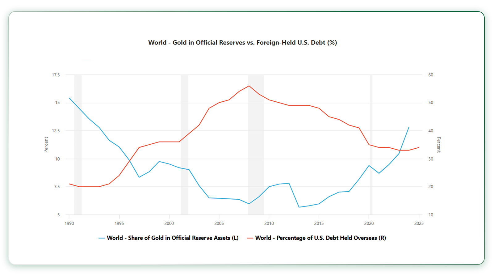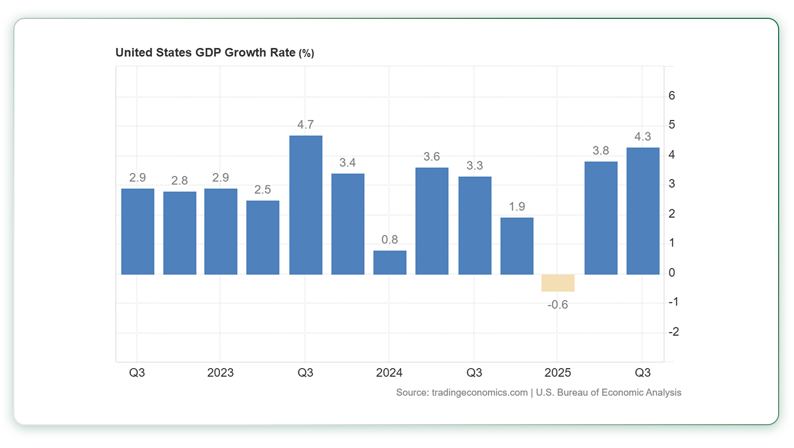 همان‌طور که مشخص است، در سال ۲۰۲۵ ذخیره طلا در سبد دارایی بانک‌های مرکزی از ذخیره اوراق قرضه آمریکا پیشی گرفته است. از طرفی، آخرین داده‌ها نشان می‌دهد که رشد اقتصادی آمریکا در فصل تابستان به ۴/۳ درصد رسیده که از پیش‌بینی‌ها بالاتر بوده و بالاترین رشد اقتصادی فصلی از ابتدای سال ۲۰۲۴ بوده است.