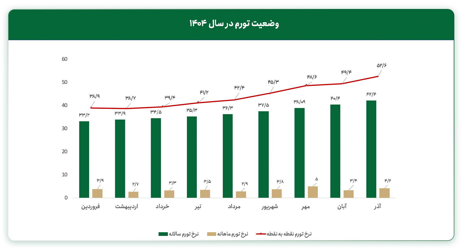 همان‌طور که مشاهده می‌شود، نرخ تورم سالانه در آذرماه با افزایش ۲ درصدی به ۴۲/۴ درصد رسیده و نرخ تورم ماهانه نیز مجددا در آذر ماه افزایش پیدا کرده است. با توجه به افزایش تقاضا در ماه‌های پایانی سال و التهابات بازار ارز و طلا، پیش‌بینی می‌شود روند افزایشی نرخ تورم ادامه‌دار باشد.