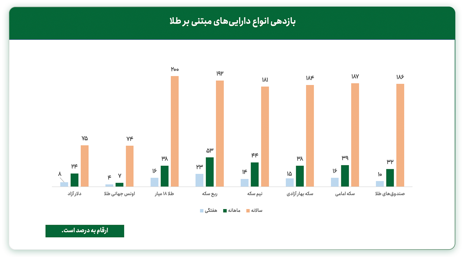 بررسی بازدهی طلا و دلار در بازه‌های زمانی مختلف، کمک زیادی به تحلیل قیمت طلا در ایران کرده و می‌توان با مقایسه بازدهی ابزارهای متنوع سرمایه‌گذاری در طلا، دید بهتری نسبت به چشم‌انداز آتی قیمت‌ها داشت. ربع سکه با بازدهی ۵۳ درصدی در یک ماه گذشته، بیشترین رشد را در مقایسه با سایر دارایی‌های مبتنی بر طلا داشته است.
