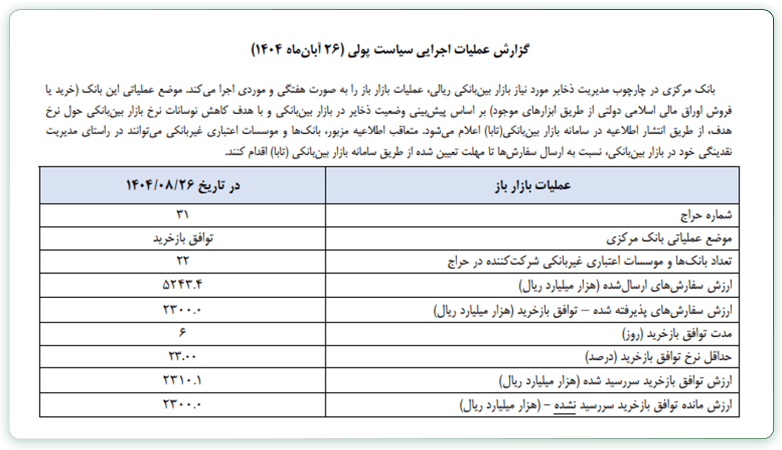 سیاست پولی با همکاری بانک مرکزی و سایر بانکهای تجاری، تخصصی و سایر موسسات مالی و اعتباری در عملیاتی تحت عنوان عملیات بازار باز (OMO) انجام میشود. عملیات بازار باز به بیان ساده عبارت است از تامین نقدینگی مورد نیاز بانکهای تجاری توسط بانک مرکزی که طی آن بانک مرکزی با فروش اوراق درآمد ثابت به بانکهای تجاری نقدینگی مورد نیاز آنها را تامین کرده و سپس طی بازه زمانی مشخصی، اقدام به بازخرید اوراق میکند. برای درک بهتر این موضوع نگاهی به یک گزارش عملیات بازار باز در بانک مرکزی ایران میاندازیم: