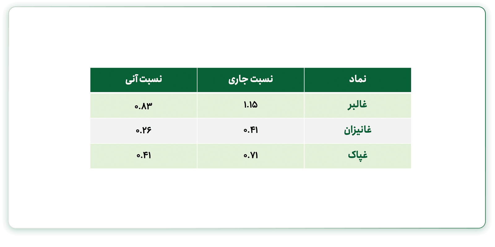 همانطور که در تصویر نمودار فوق مشاهده میکنید لبنیات پاک طی ۵ فصل گذشته بیشترین میزان سرمایه در گردش منفی را ثبت کرده است و لبنیات مانیزان با روند نوسانی همراه بوده است. لبنیات کالبر با نماد غالبر وضعیت با ثباتی در رابطه با میزان سرمایه در گردش فصلی داشته است. حالا، نسبت جاری فصل آخر هر ۳ شرکت را بررسی میکنیم: