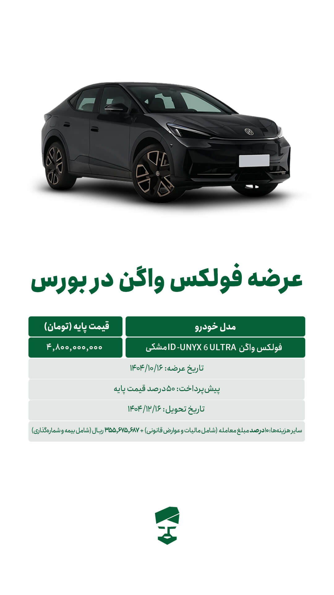 پس از وقفه طولانی مدت از آخرین عرضه خودرو در بورس، سرانجام ماموت خودرو در روز ۱۳ آبان ماه، ۳۰ دستگاه خودروی برقی فولکس واگن مدل ID-UNYX 06 ULTRA را از طریق بورس کالا عرضه کرد. حال پس از گذشت ۲ ماه از آخرین عرضه این خودرو، ماموت خودرو تصمیم دارد بار دیگر ۳۰ دستگاه از این خودرو را در روز ۱۶ دی ماه از طریق بورس کالا عرضه کند. قیمت پایه در نظر گرفته شده برای این خودرو ۴,۸۰۰,۰۰۰,۰۰۰ تومان و میزان پیش پرداخت نیز ۵۰ درصد اعلام شده است. همچنین خریداران موظفند ۱۰ درصد مالیات بر ارزش افزوده و ۳۵میلیون و ۵۶۸ هزار تومان هزینههای جانبی (شمارهگذاری، بیمه و …) را نیز پرداخت کنند.