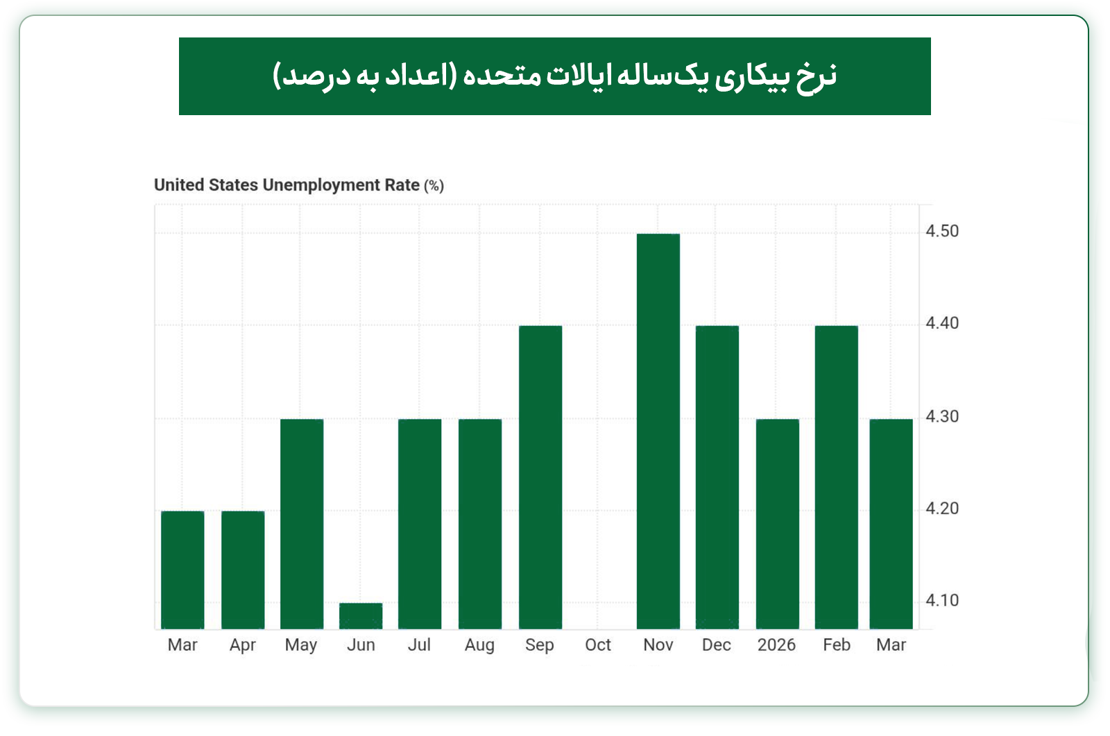 در همین حال، تازهترین دادههای بازار کار آمریکا نشان میدهد نرخ بیکاری در ماه مارس ۲۰۲۶ (اسفند و فروردین) با کاهش جزئی، به ۴/۳ درصد رسیده است؛ رقمی که همچنان بالاتر از سطح موردنظر فدرال رزرو و دولت آمریکا قرار دارد.