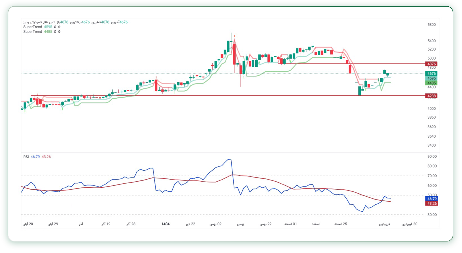 اونس جهانی طلا پس از برخورد به سطح حمایتی ۴۲۳۸ دلار، با رشد قابلتوجهی همراه شد و تا محدوده ۴۷۵۰ دلار پیشروی کرد. در حال حاضر، اندیکاتور سوپرترند سیگنال صعودی صادر میکند. همچنین خط RSI بالاتر از میانگین متحرک ساده ۲۰روزه قرار دارد که میتواند تأییدی بر تداوم روند صعودی باشد. با این حال، محدوده مقاومتی ۴۸۰۰ تا ۵۰۰۰ دلار میتواند بهطور طبیعی مانعی جدی برای ادامه رشد طلای جهانی باشد. افزون بر این، وابستگی شدید قیمت داراییها به اخبار مرتبط با تحولات جنگی ممکن است موجب افزایش خطا در تحلیلهای تکنیکال شود.