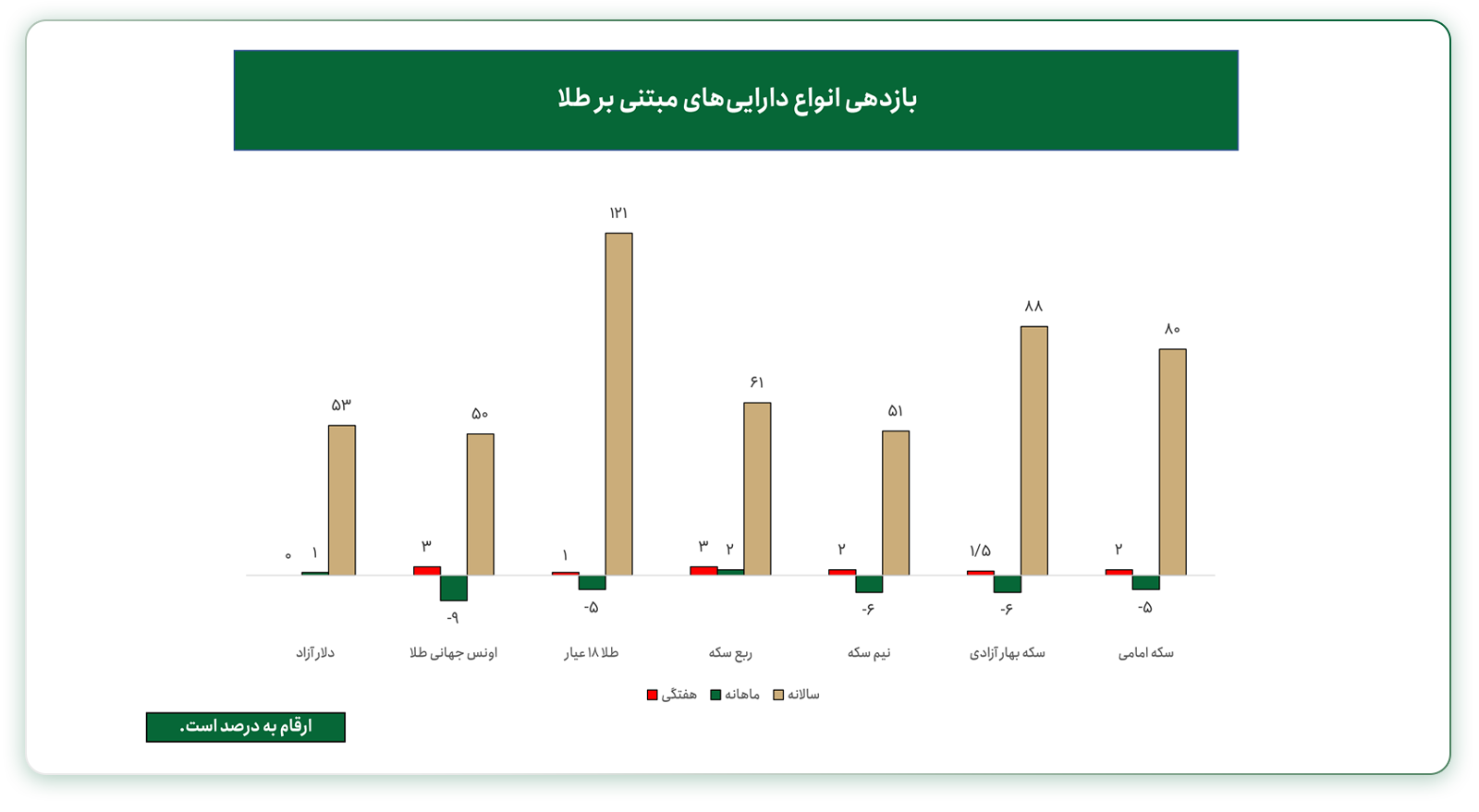 بررسی بازدهی طلا و دلار در بازههای زمانی مختلف، کمک زیادی به تحلیل قیمت طلا در ایران کرده و میتوان با مقایسه بازدهی ابزارهای متنوع سرمایهگذاری در طلا، دید بهتری نسبت به چشمانداز آتی قیمتها داشت. در این مدت تمامی داراییهای مبتنی بر طلا بازدهی منفی داشتهاند، با این وجود طلای ۱۸ عیار در بلندمدت بازدهی بالاتری داشته است.
