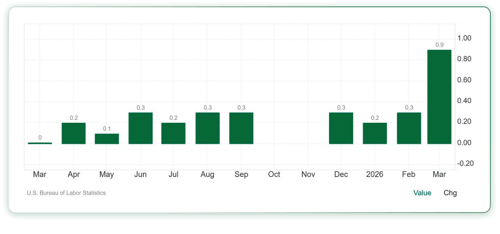 آخرین آمار تورم آمریکا پس از جنگ نشان میدهد، نرخ تورم ماهانه آمریکا در ماه مارس ۲۰۲۶ به نزدیک یک درصد رسیده که در یک سال اخیر بیسابقه بوده است. در نمودار زیر میتوانید نمودار تورم ماهانه آمریکا را مشاهده کنید.