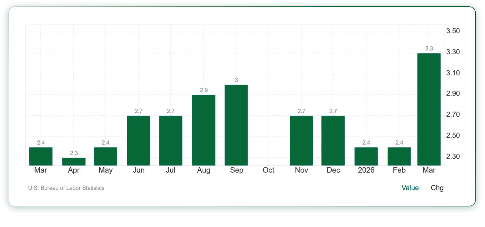نرخ تورم سالانه آمریکا نیز در ماه مارس(نسبت به مدت مشابه سال گذشته آن) با جهش بیسابقهای به ۳.۳ درصد رسیده که باعث افزایش نارضایتی مردم آمریکا از جهش قیمت سوخت و سایر کالاها و خدمات شده است. در نمودار زیر میتوانید روند تورم سالانه آمریکا در یک سال اخیر را مشاهده کنید.