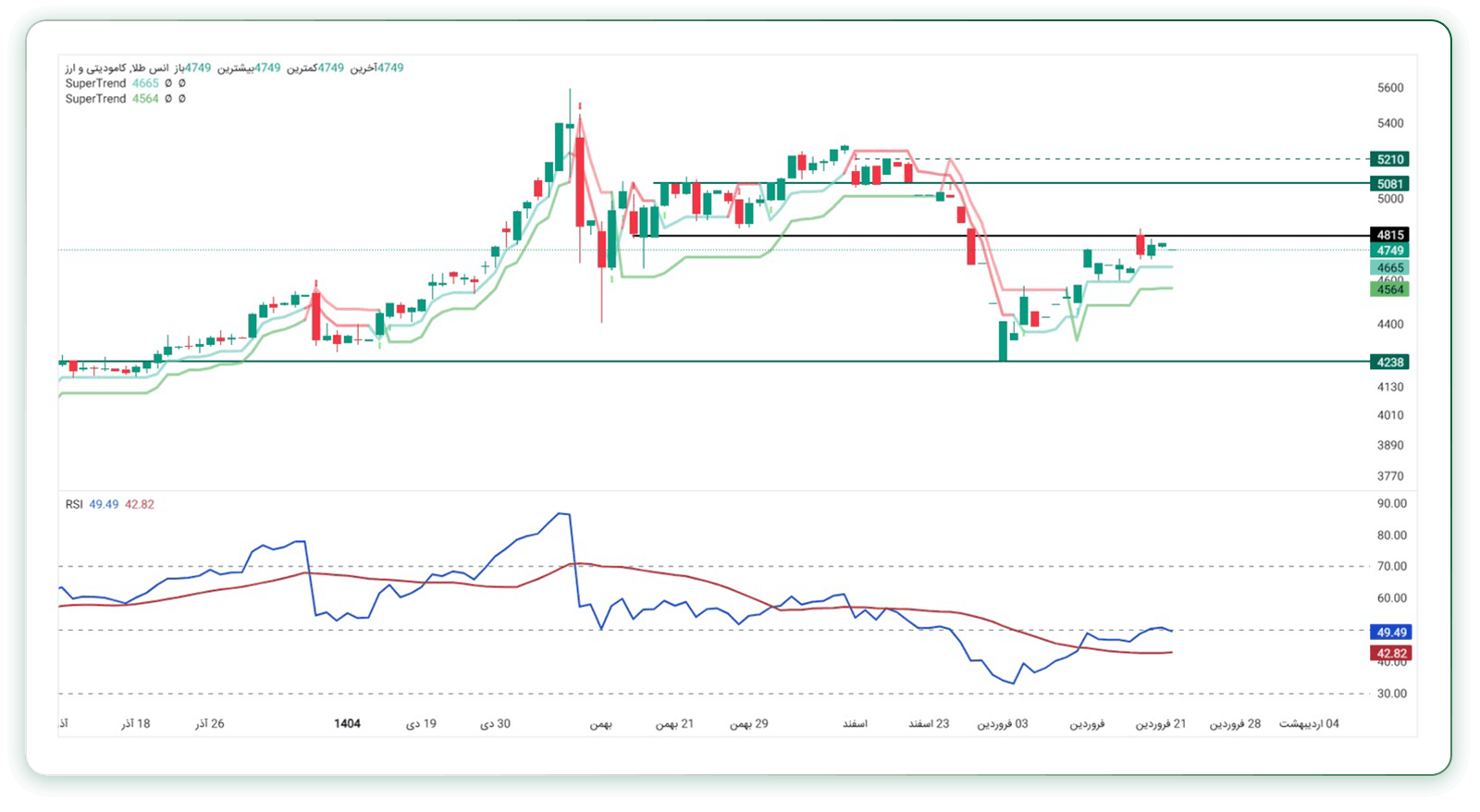اونس جهانی طلا کماکان با احتیاط به روند صعودی خود ادامه میدهد. انس طلا با رسیدن به مقاومت ۴۸۰۰ دلار، با عرضه مواجه شد و در حال حاضر اندیکاتور سوپرترند نواحی حمایتی ۴۵۶۴ تا ۴۶۶۵ را نشان میدهند. همچنین، در صورتی که از مقاومت ۴۸۰۰ دلار عبور کند، مقاومت ۵۰۸۱ دلار میتواند مانع مهمی برای ادامه روند صعودی باشد.