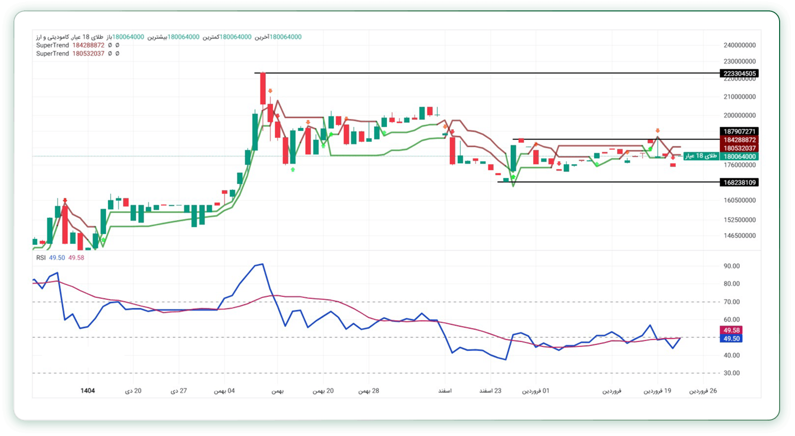 تحلیل تکنیکال طلای ۱۸ عیار همچنان از تداوم روند خنثی در بازار حکایت دارد. اندیکاتورهای سوپرترند و RSI نیز وضعیت بیجهتی و بلاتکلیفی را تأیید میکنند و نشانهای از یک روند قوی در کوتاهمدت دیده نمیشود. با این حال، با توجه به ساختار حرکتی قیمت و رفتار اخیر بازار، احتمال تحقق سناریوی صعودی نسبت به اصلاح نزولی همچنان بیشتر ارزیابی میشود.