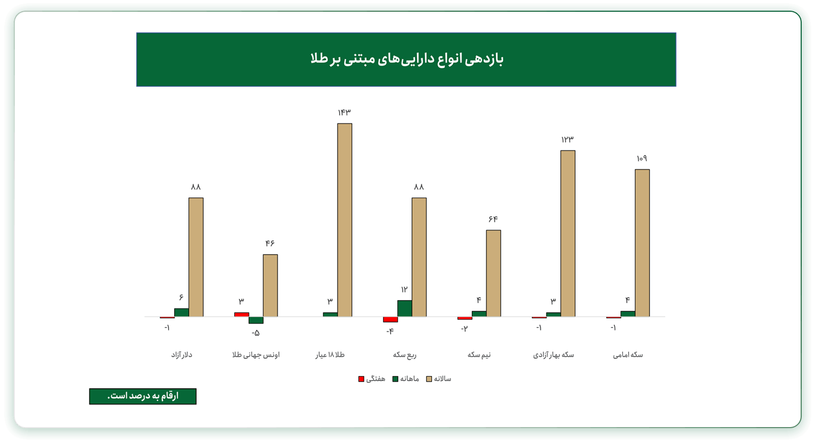 بررسی بازدهی طلا و دلار در بازههای زمانی مختلف، کمک زیادی به تحلیل قیمت طلا در ایران کرده و میتوان با مقایسه بازدهی ابزارهای متنوع سرمایهگذاری در طلا، دید بهتری نسبت به چشمانداز آتی قیمتها داشت. در این مدت تمامی داراییهای مبتنی بر طلا بازدهی منفی داشتهاند، با این وجود طلای ۱۸ عیار در بلندمدت بازدهی بالاتری داشته است.