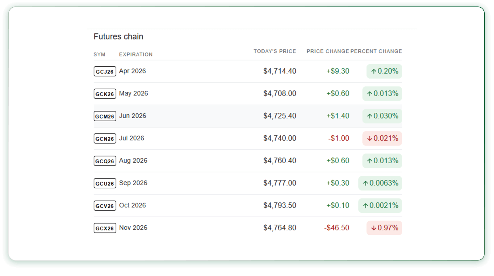 بررسی زنجیره قراردادهای آتی اونس جهانی طلا نشان میدهد که بازار در ماههای پیشِرو انتظار یک مسیر قیمتی نسبتاً پایدار با گرایش ملایم صعودی را دارد. همزمان، پیشبینیها حکایت از آن دارند که فدرال رزرو با احتمال حدود ۹۹.۵ درصد در نشست هفته آینده نرخ بهره را بدون تغییر حفظ خواهد کرد؛ موضوعی که معمولاً از شدت نوسانات در بازار طلا میکاهد.