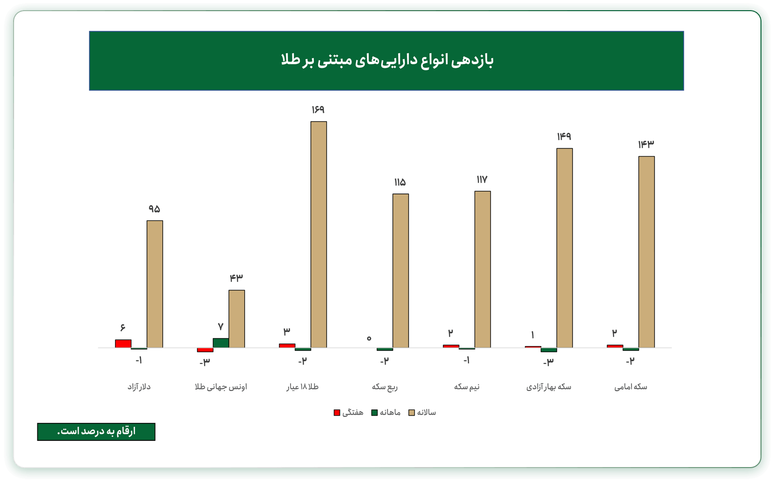 بررسی بازدهی طلا و دلار در بازههای زمانی مختلف، کمک زیادی به تحلیل قیمت طلا در ایران کرده و میتوان با مقایسه بازدهی ابزارهای متنوع سرمایهگذاری در طلا، دید بهتری نسبت به چشمانداز آتی قیمتها داشت. در این مدت تمامی داراییهای مبتنی بر طلا بازدهی منفی داشتهاند، با این وجود طلای ۱۸ عیار در بلندمدت بازدهی بالاتری به ثبت رسانده است.