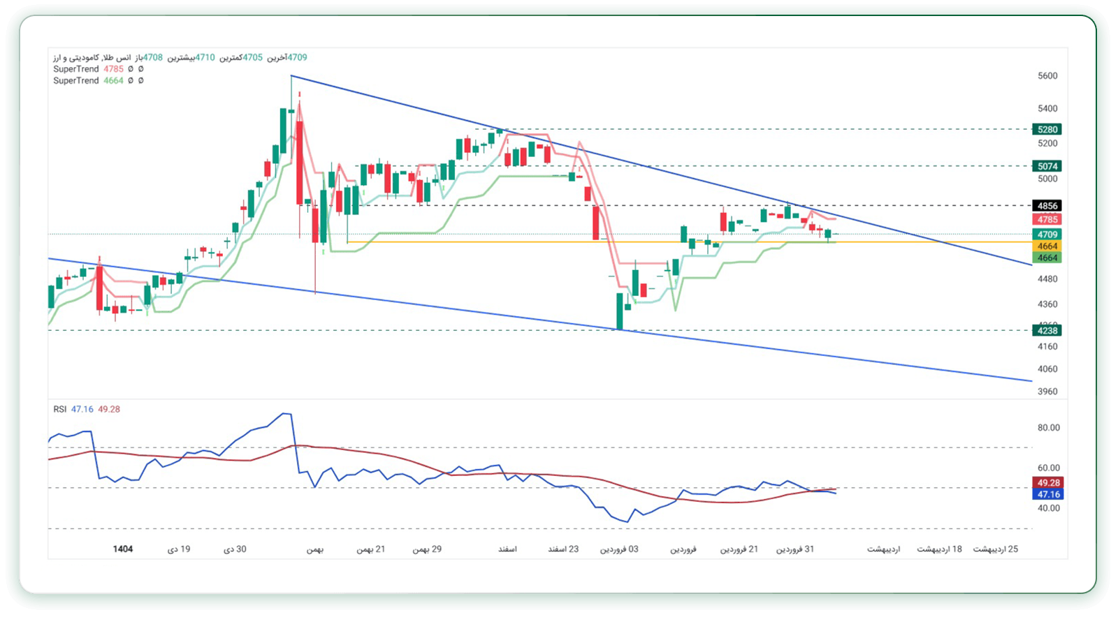 اونس جهانی طلا پس از صعود تا سطح ۴۸۵۶ دلار نتوانست از این مقاومت عبور کند و در نهایت با افتی حدود ۳ درصدی به محدوده حمایتی ۴۶۶۴ دلار بازگشت. در حال حاضر برخی نشانههای تکنیکال از احتمال یک اصلاح موقت در قیمت طلا حکایت دارند. از جمله اینکه میانگین متحرک ساده ۲۰ روزه بالاتر از شاخص قدرت نسبی (RSI) قرار گرفته که این مورد نیز نشانهای از تضعیف مومنتوم صعودی را نشان میدهد.