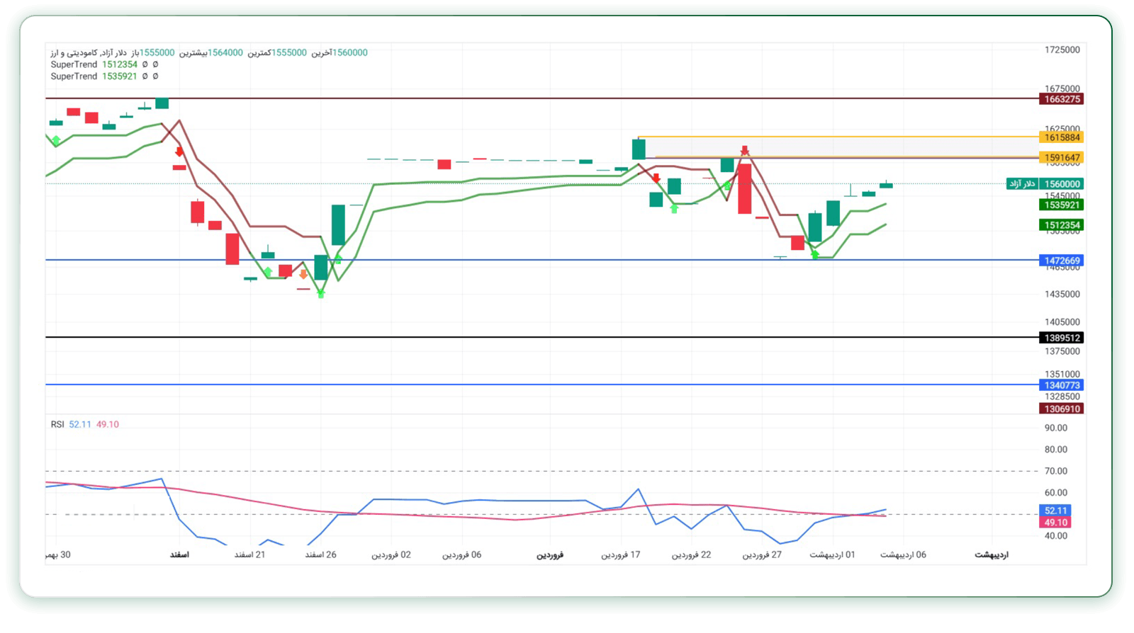 قیمت دلار در بازار آزاد پس از مدتها، شکلگیری یک روند صعودی را نشان میدهد. در حال حاضر اندیکاتورهای سوپرترند وRSI روند صعودی را تایید میکنند. از طرفی محدوده ۱۵۹ تا ۱۶۱ هزار تومان یک ناحیه مقاومتی مهم محسوب میشوند که باید دید در صورت رسیدن قیمت دلار به محدوده فوق، آیا توان عبور از آن وجود دارد یا خیر.